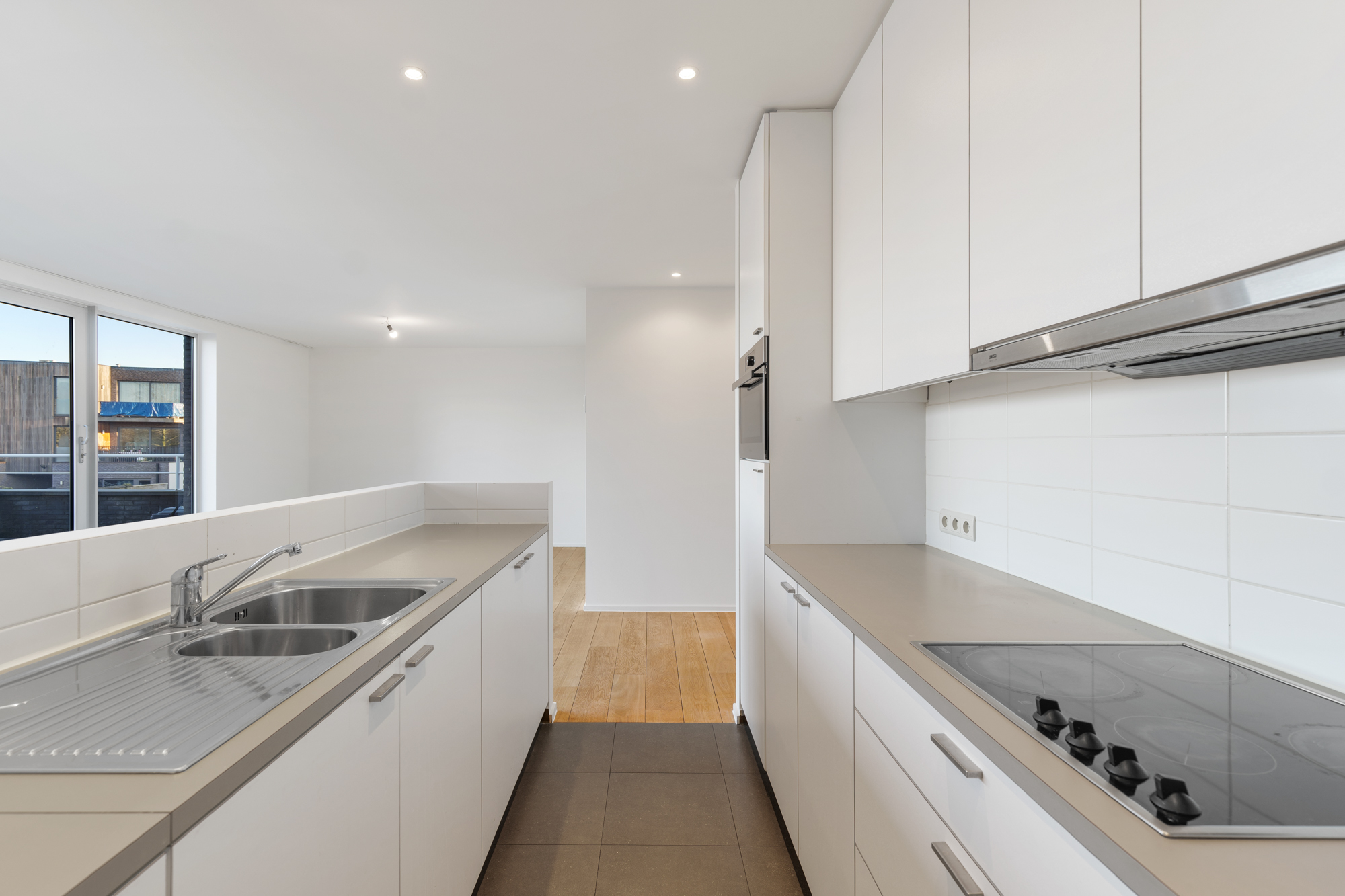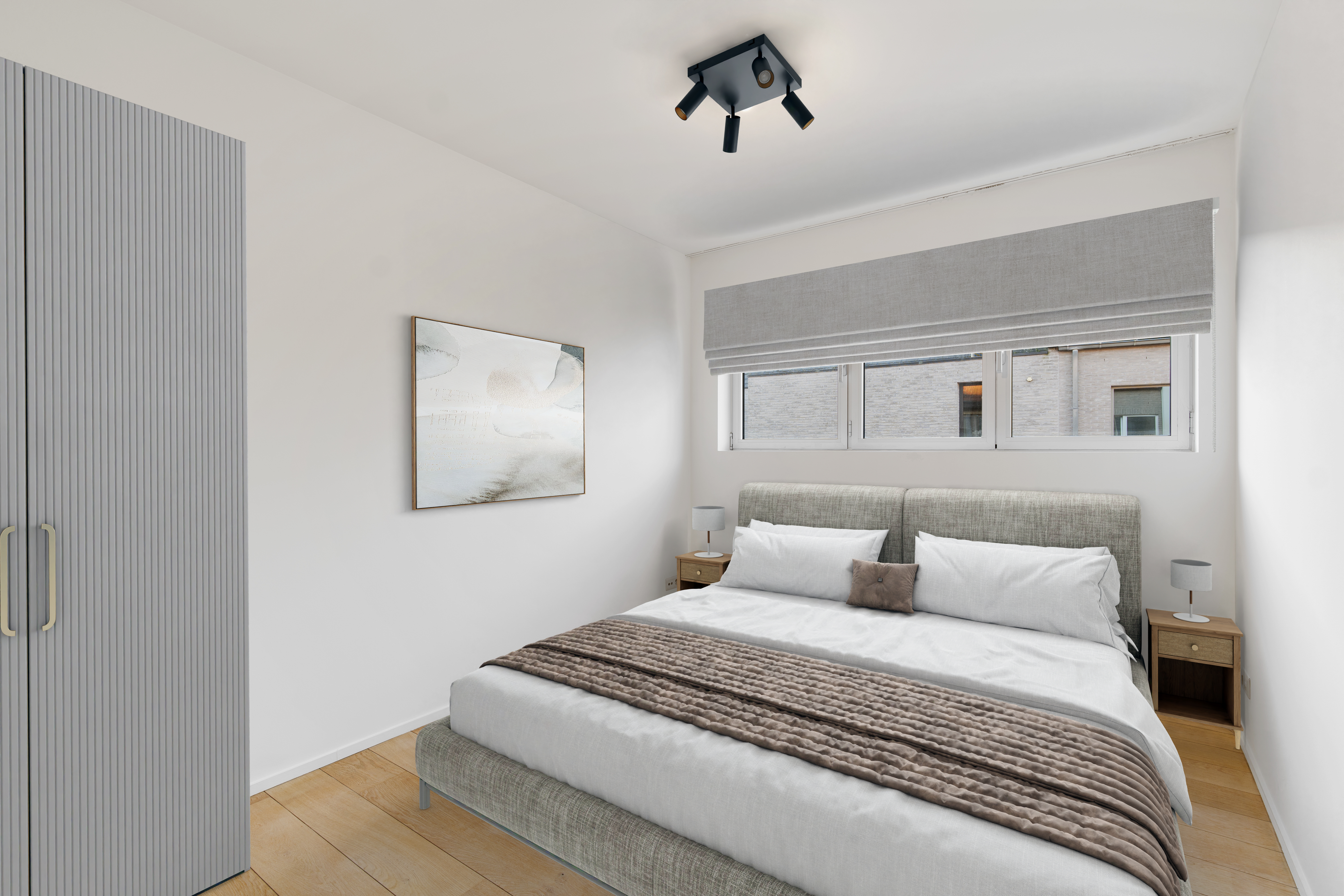 Het appartement op het eerste verdiep is bijzonder licht en stijlvol door de aanwezigheid van eiken parket en een groot schuifraam. Dit schuifraam is over gans de gevelbreedte en heeft zicht op het grote terras. Dit appartement beschikt over 2 slaapkamers. In de aparte berging kan je jouw was en droogmachine moeiteloos plaatsen.