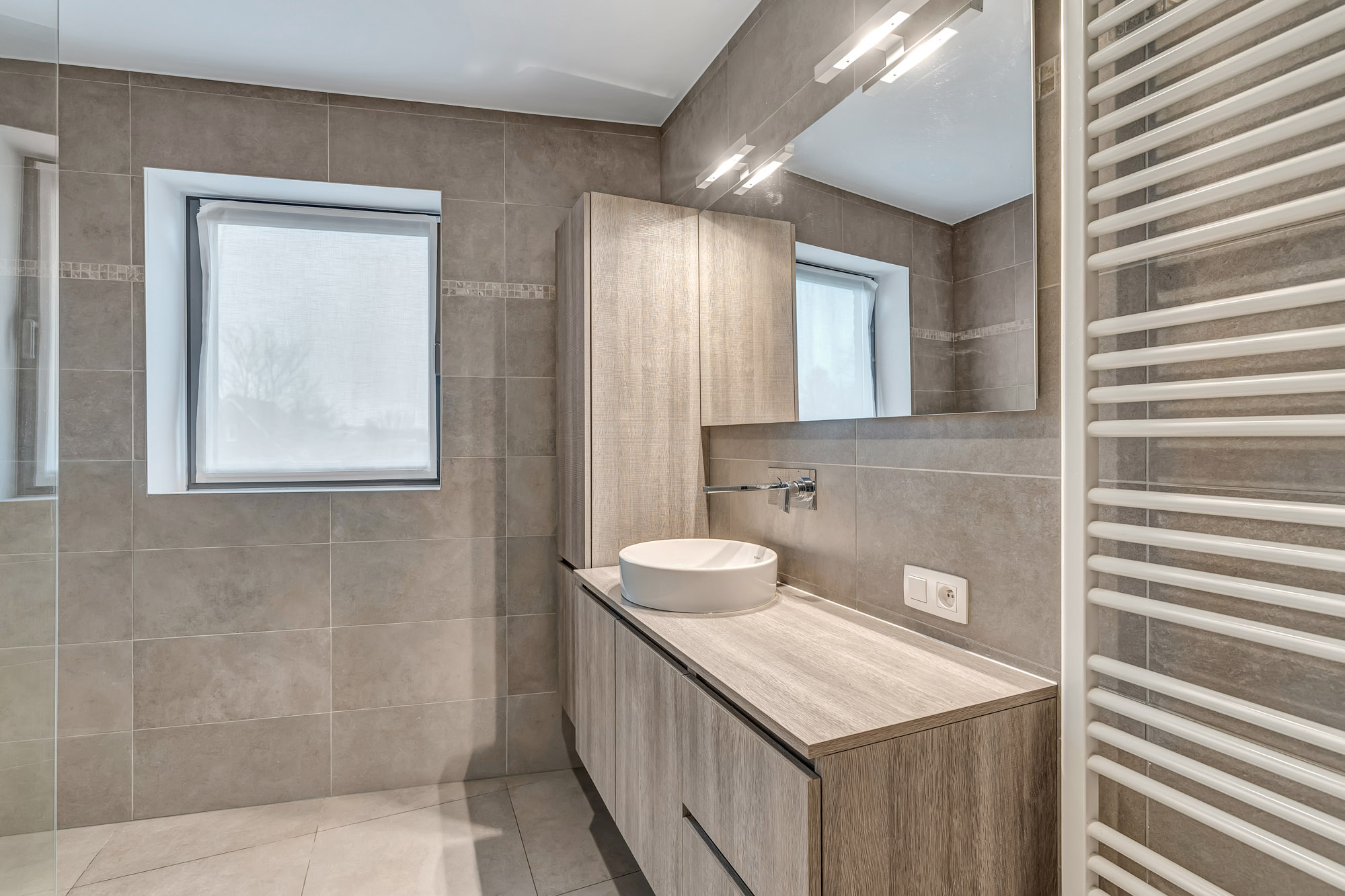 De badkamer is ruim en voorzien van alle comfort. De kamers zijn eveneens ruim met veel natuurlijk licht. Dit huis leent zich perfect om wonen en werken te combineren.